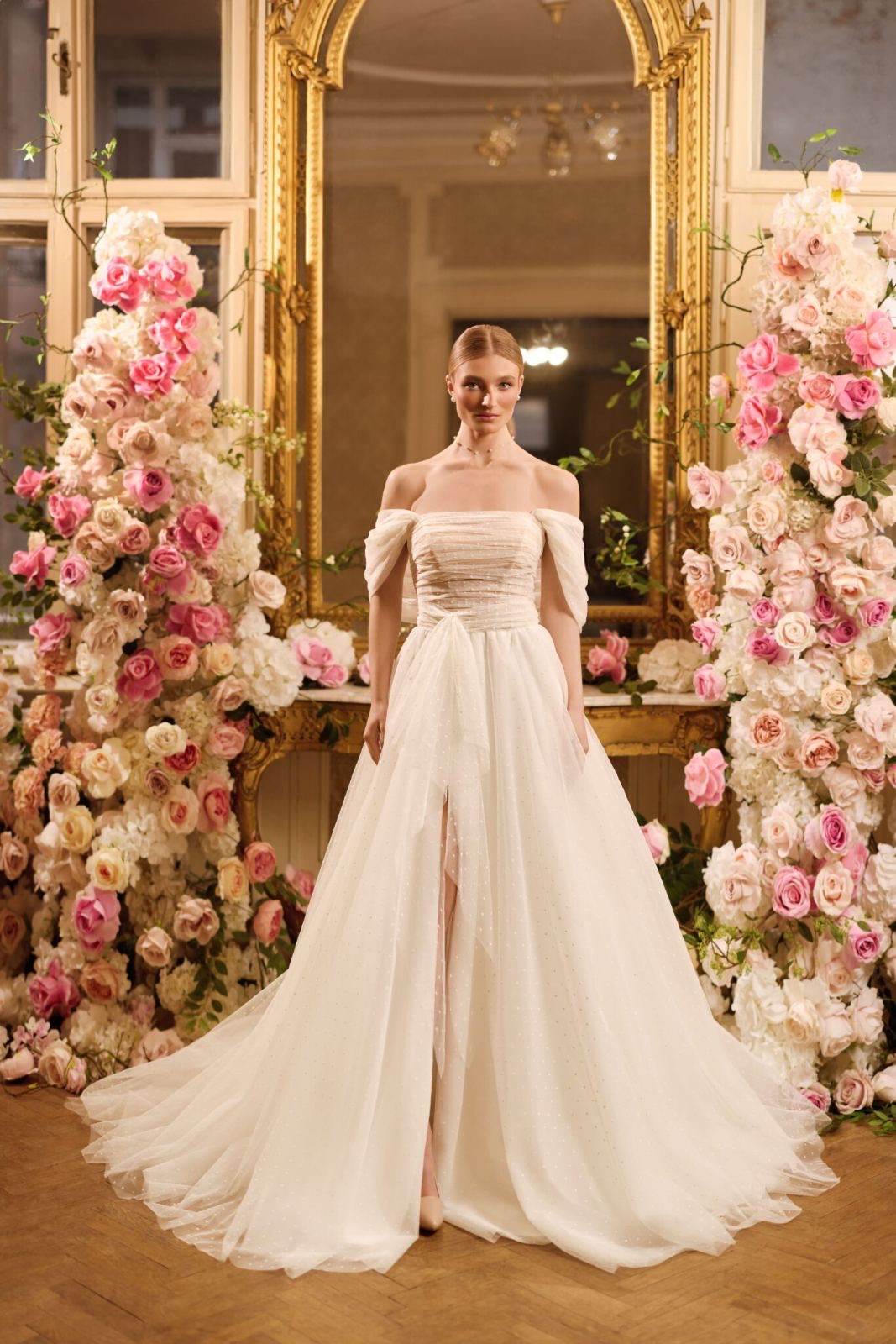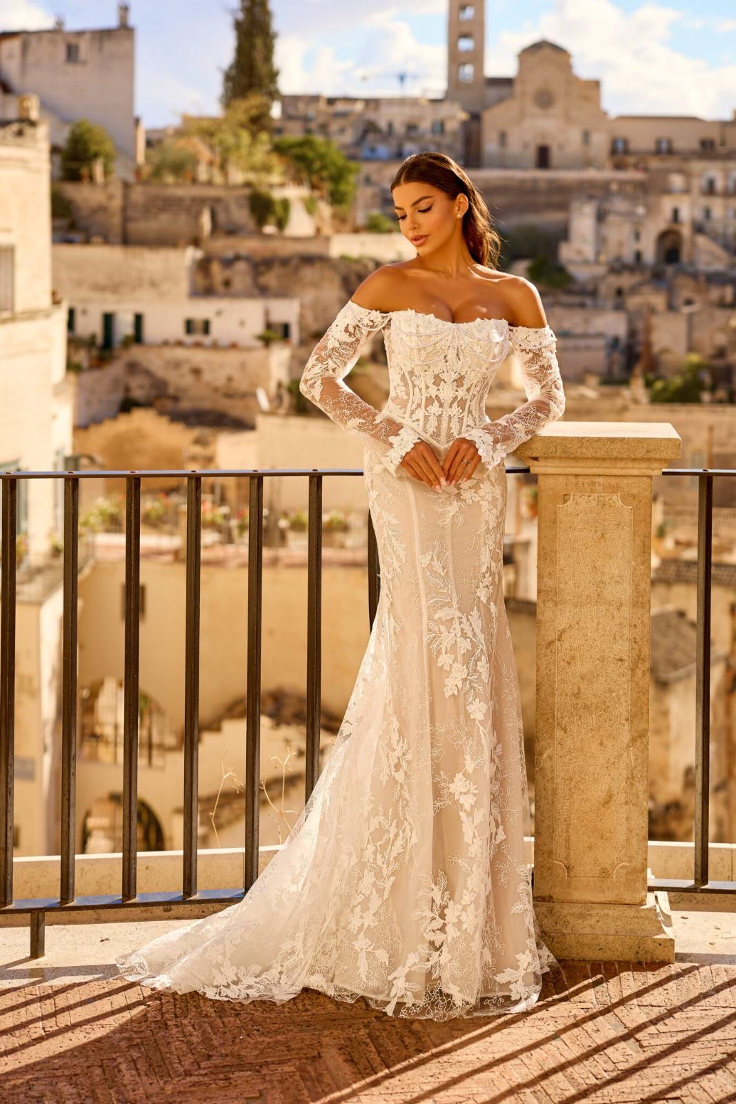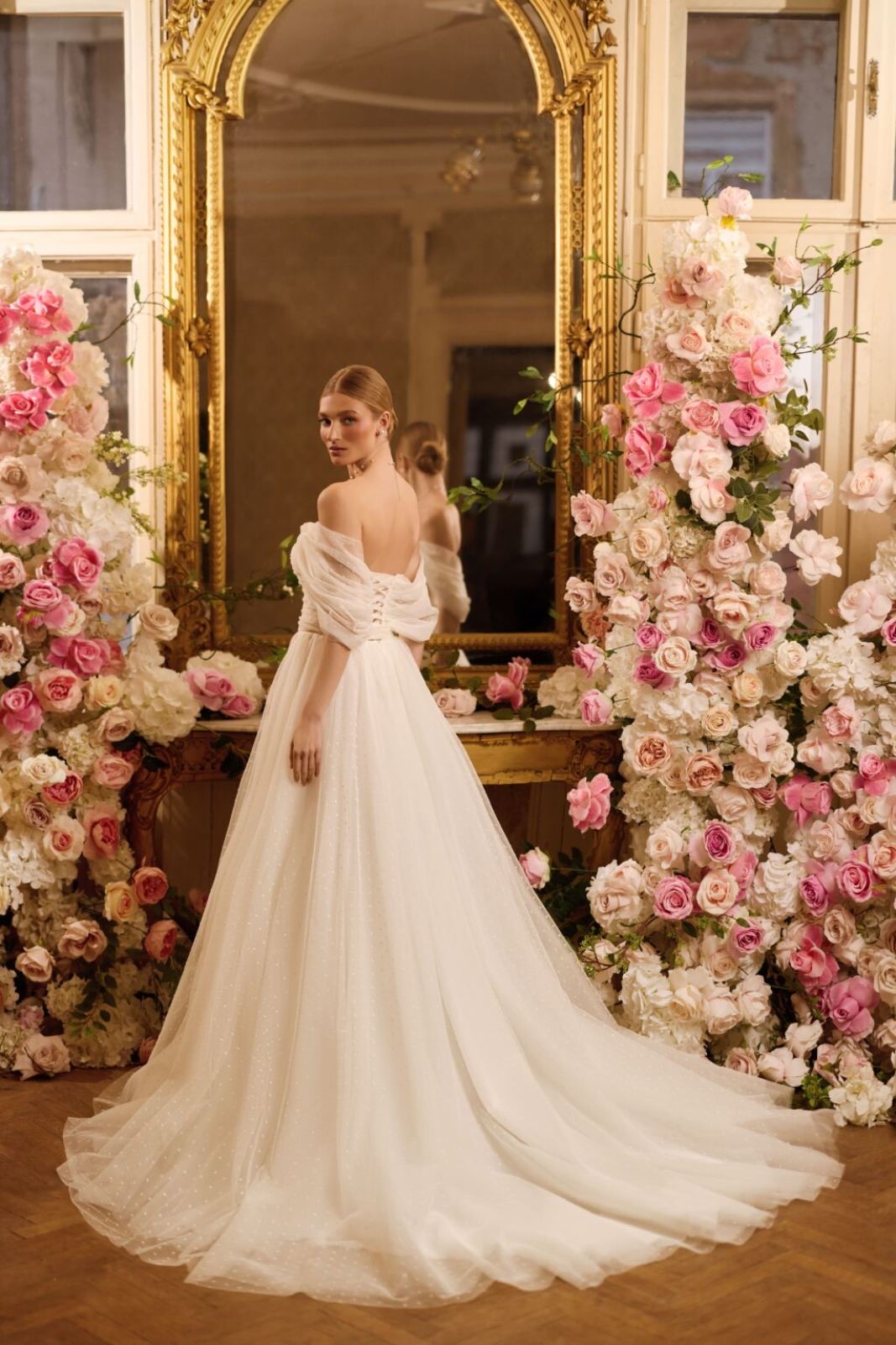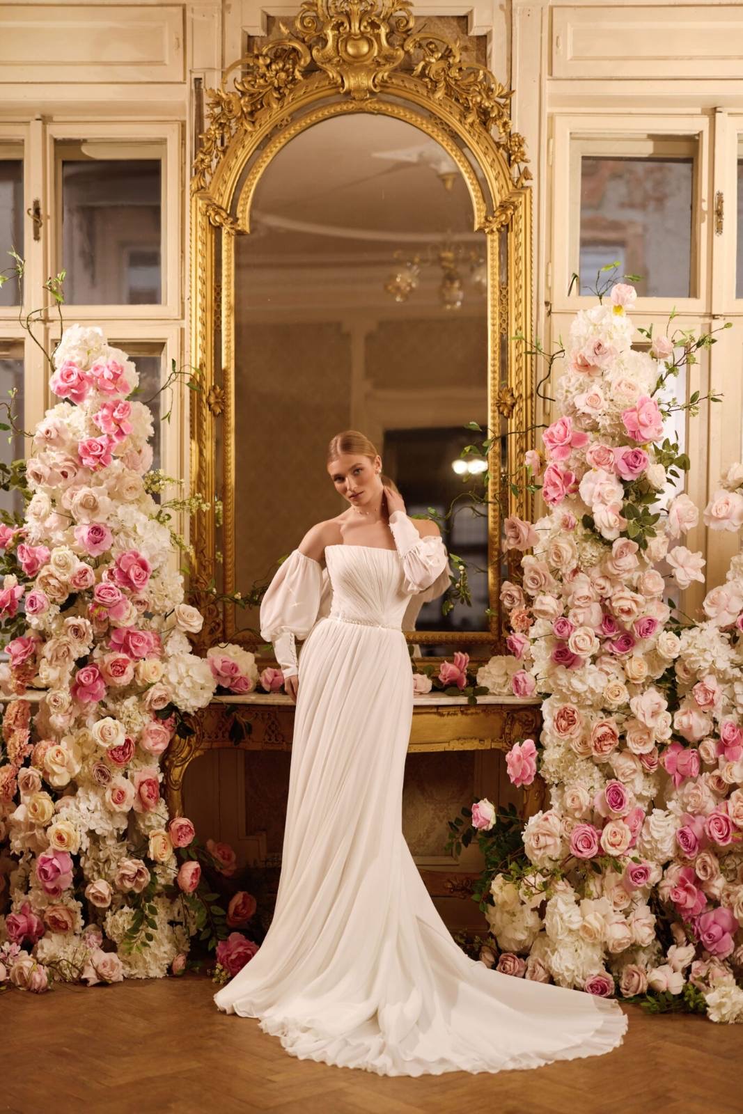 Ρομαντικό νυφικό με Φουσκωτά Μανίκια και Αέρινη Ουρά