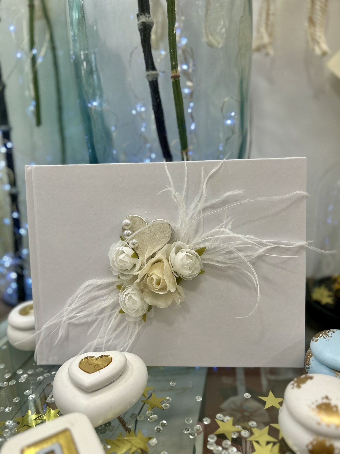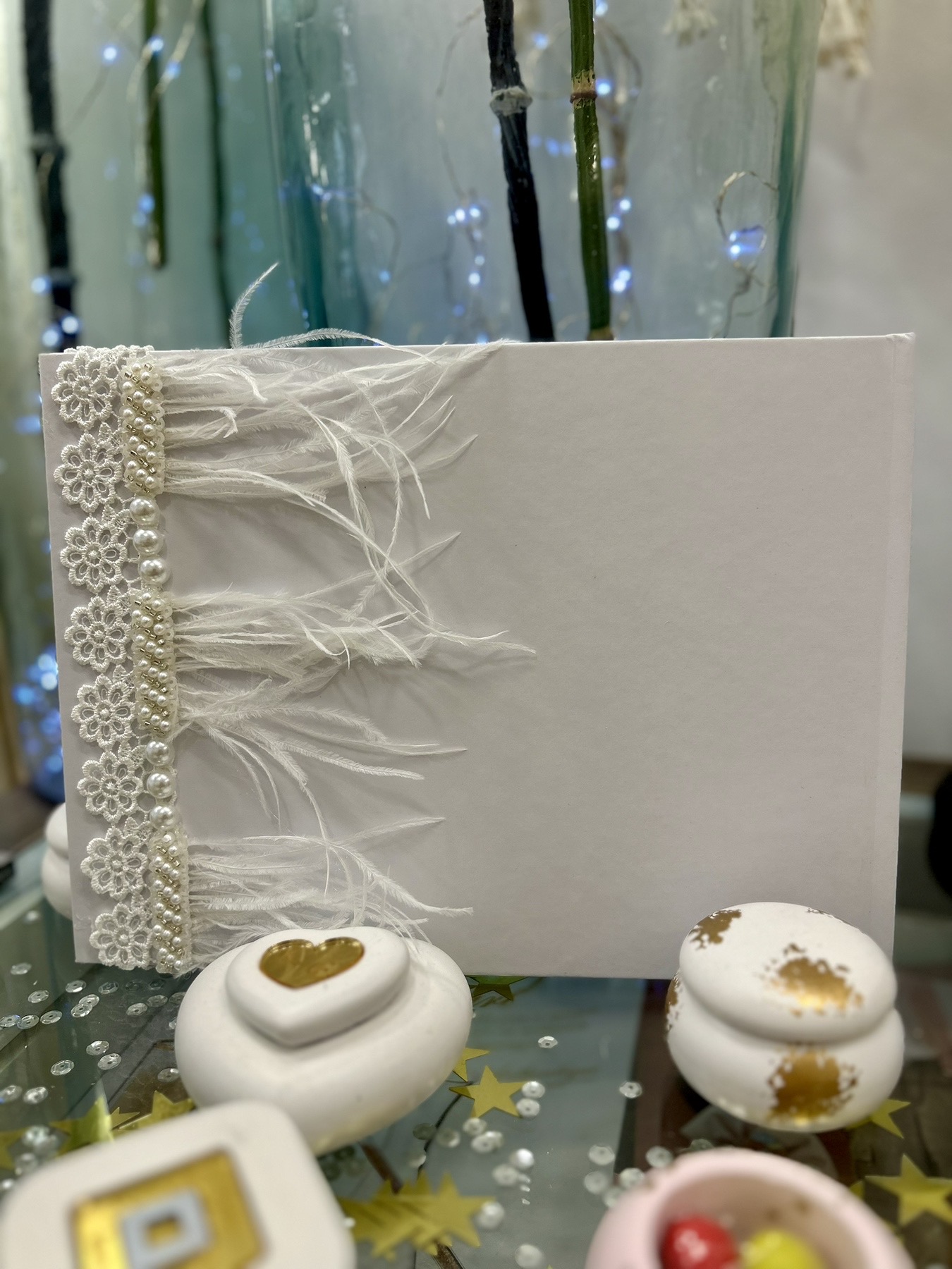 Βιβλίο ευχών γάμου με δαντέλα και πούπουλα