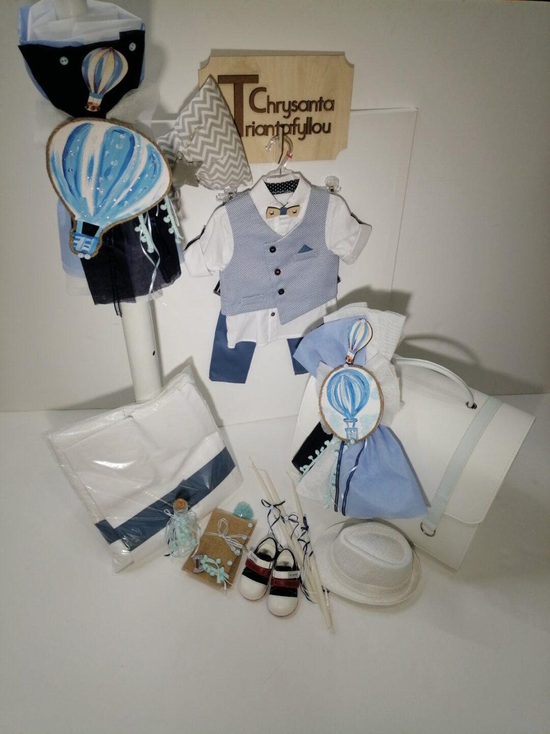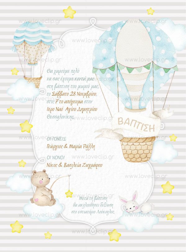 Επίλεξε για τη βάπτιση θέμα το Αερόστατο. Πρόσθεσε αυτή τη μακέτα στο καλάθι σου, διάλεξε το είδος προσκλητηρίου εδώ, την μπομπονιέρα εδώ και το πλήρες σετ βάπτισης εδώ, βάλτα όλα μαζί στο καλάθι αγορών σου μαζί με αυτό το θέμα και εμείς θα εφαρμόσουμε το θέμα σου παντού!