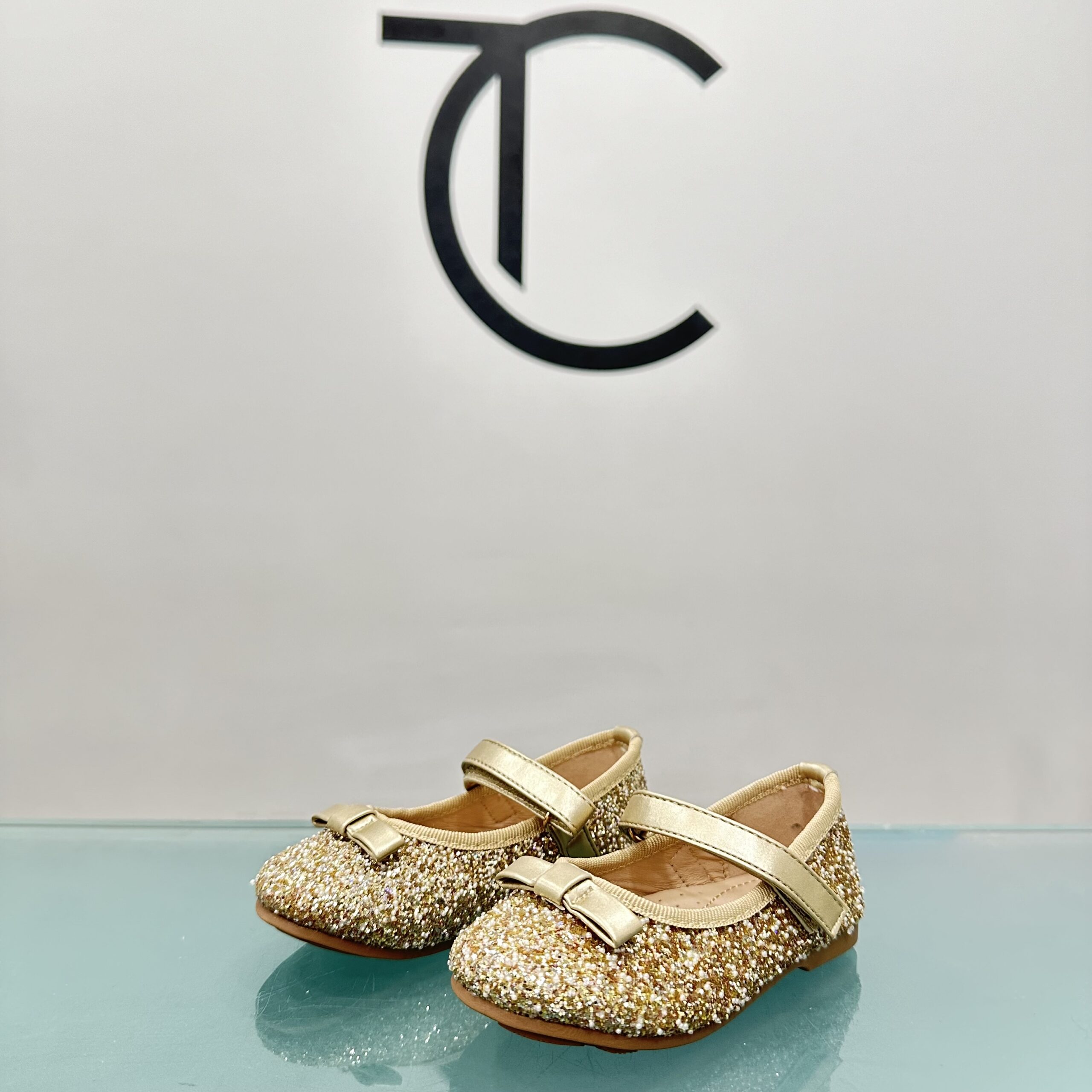 Βαπτιστικό παπούτσι μπαρέτα σε χρυσό χρώμα με γκλίτερ και φιογκάκι. Με δερμάτινο ανατομικό πάτο για ξεκούραστο περπάτημα, κατάλληλο για τα πρώτα βήματα του παιδιού. Ελληνικής ραφής