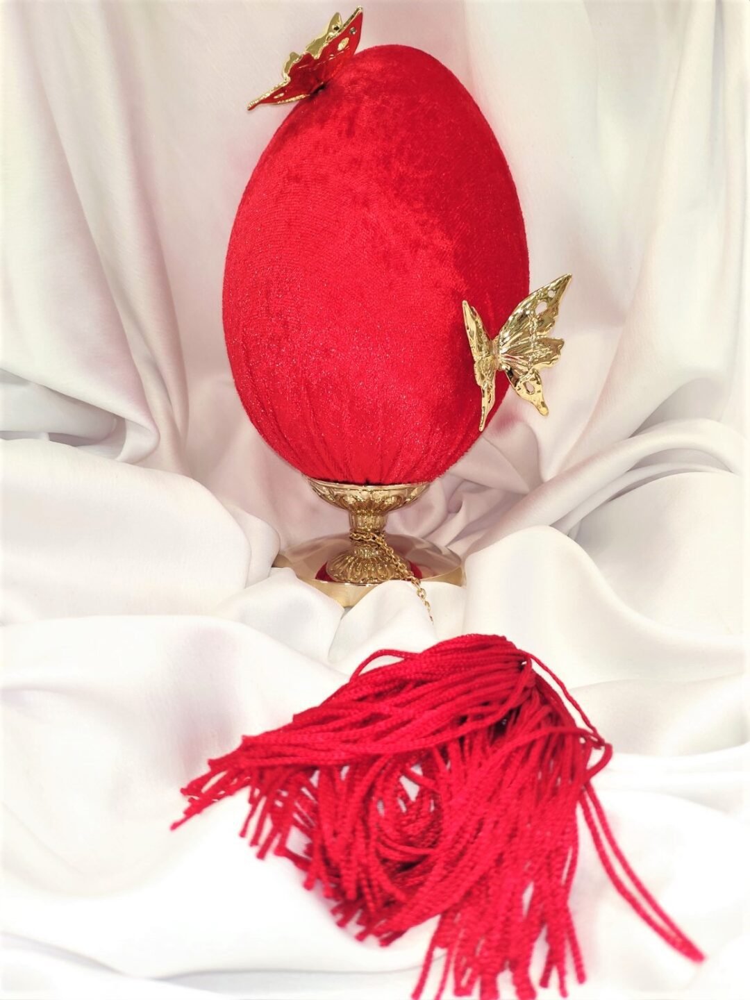 Διακοσμητικό αυγό σε κόκκινο βελούδο με επίχρυσες 24Καρατίων πεταλούδες, με μεταξωτή φούντα. Ιδανικό δώρο για το Πάσχα! Ύψος 25cm