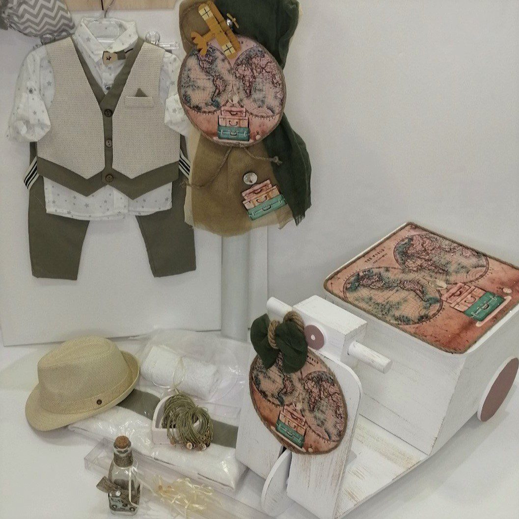 Σετ βάπτισης με βέσπα και θέμα ταξίδια, ο γύρος του κόσμου με ένα αεροπλάνο. Το σετ περιλαμβάνει το βαπτιστικό ρούχο σε γήινες αποχρώσεις του χακί, ξύλινη βέσπα με αποθηκευτικό χώρο, ζωγραφισμένη με τον παγκόσμιο χάρτη σε αποχρώσεις του καφέ, με τεχνική decoupage, στολισμός λαμπάδας με το ίδιο θέμα σε ξύλινο στρογγυλό διακοσμητικό (δεν συμπεριλαμβάνεται το κερί), 50 μαρτυρικά, 3 κεράκια, μπουκαλάκι λαδιού, σαπουνάκια, πετσέτες, σετ λαδόπανα και εσώρουχα.