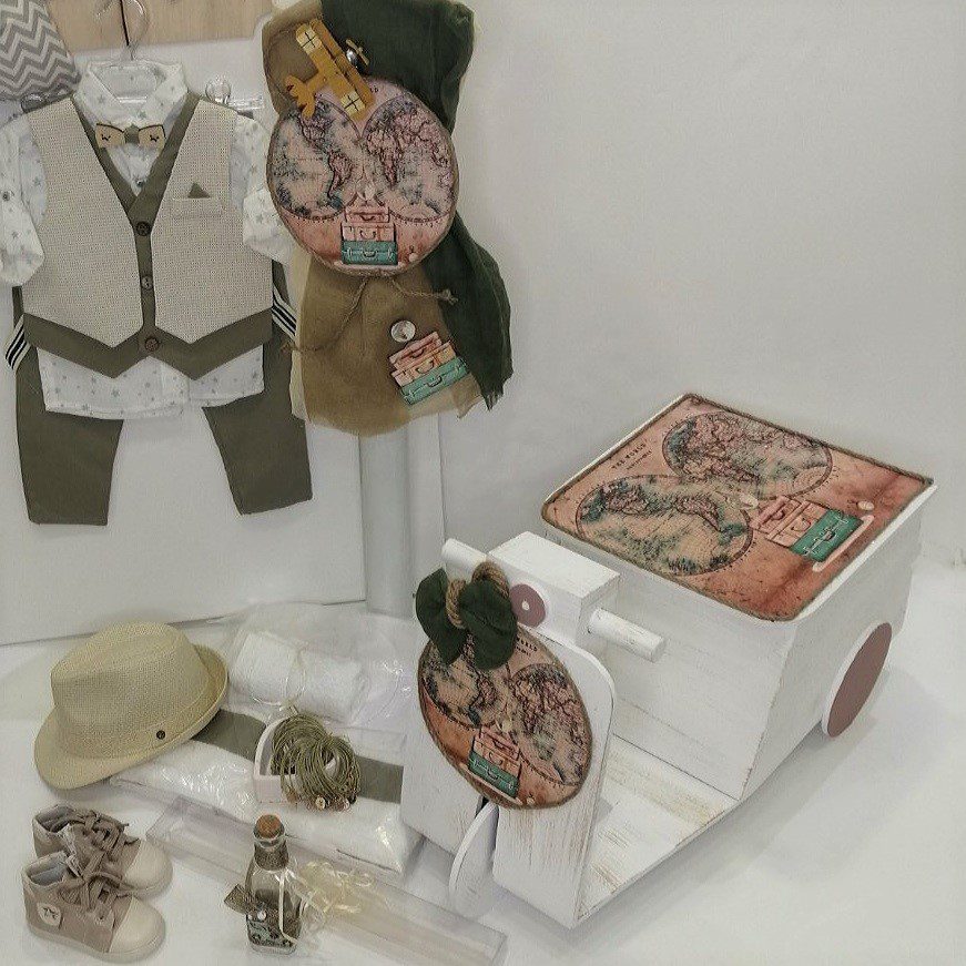 Σετ βάπτισης με βέσπα και θέμα ταξίδια, ο γύρος του κόσμου με ένα αεροπλάνο. Το σετ περιλαμβάνει το βαπτιστικό ρούχο σε γήινες αποχρώσεις του χακί, ανατομικό δερμάτινο παπουτσάκι σε μπεζ, ξύλινη βέσπα με αποθηκευτικό χώρο, ζωγραφισμένη με τον παγκόσμιο χάρτη σε αποχρώσεις του καφέ, με τεχνική decoupage, στολισμός λαμπάδας με το ίδιο θέμα σε ξύλινο στρογγυλό διακοσμητικό (δεν συμπεριλαμβάνεται το κερί), 50 μαρτυρικά, 3 κεράκια, μπουκαλάκι λαδιού, σαπουνάκια, πετσέτες, σετ λαδόπανα και εσώρουχα. Το σετ κουτί βάφτισης είναι χειροποίητο και ζωγραφισμένο στο χέρι και χρειάζεται 10-12 μέρες παράδοσης.