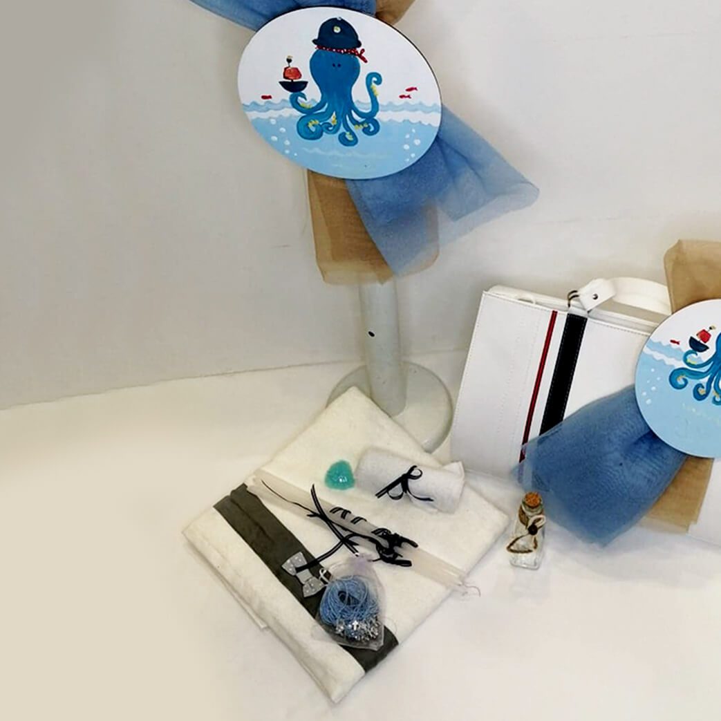 Σετ βάπτισης με άσπρη δερμάτινη βαλίτσα με διακόσμηση κόκκινη και μπλε κορδέλα και θέμα το Χταποδάκι. Το σετ περιλαμβάνει δερμάτινη βαλίτσα στολισμένη, στολισμό λαμπάδας (δεν συμπεριλαμβάνεται το κερί) με Χταποδάκι ζωγραφισμένο στο χέρι, 50 μαρτυρικά, 3 κεράκια, μπουκαλάκι λαδιού, σαπουνάκια, πετσέτες, σετ λαδόπανα και εσώρουχα.